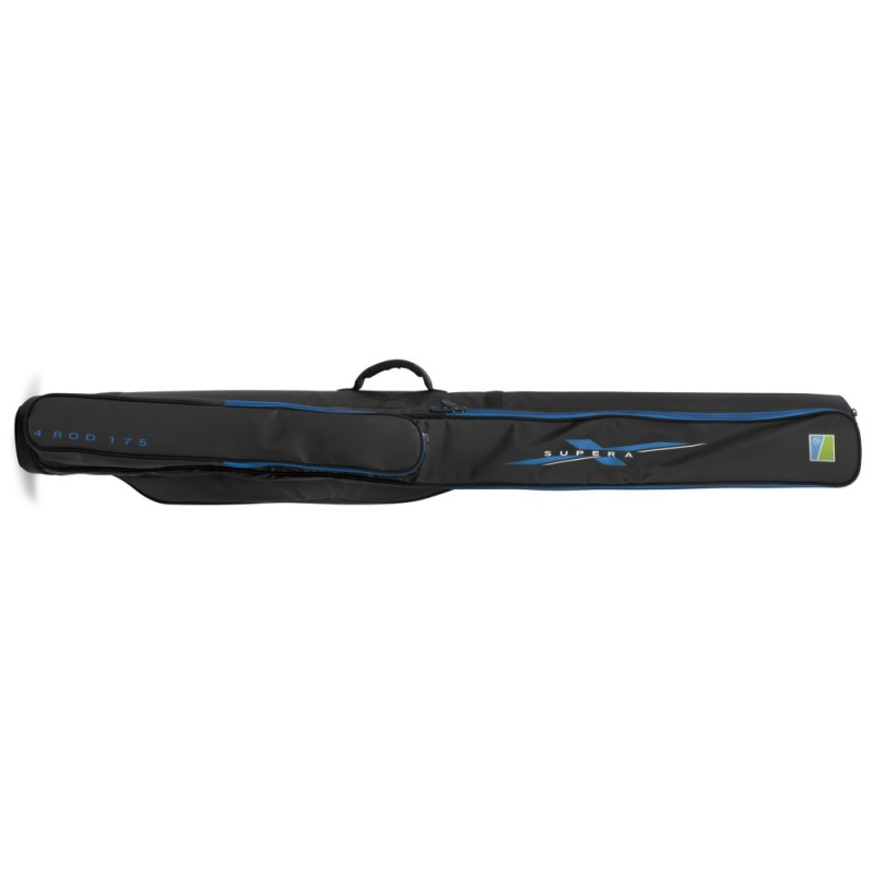 P0130113 Pokrowiec Preston Supera X 4 Rod 175cm - Obszerny pokrowiec, który pomieści co najmniej cztery 2-częściowe wędziska o długości 11ft (3,35 m) lub krótsze, idealny dla wędkarzy, którzy chcą mieć przy sobie wędki na każdą ewentualność. Pokrowiec zbudowany z wykorzystaniem twardej powłoki zewnętrznej, zapewnia maksymalną ochronę podczas transportu. Ma dwie zewnętrzne kieszenie: na sztycę do podbieraka oraz na etui Tip Safe na zapasowe szczytówki.