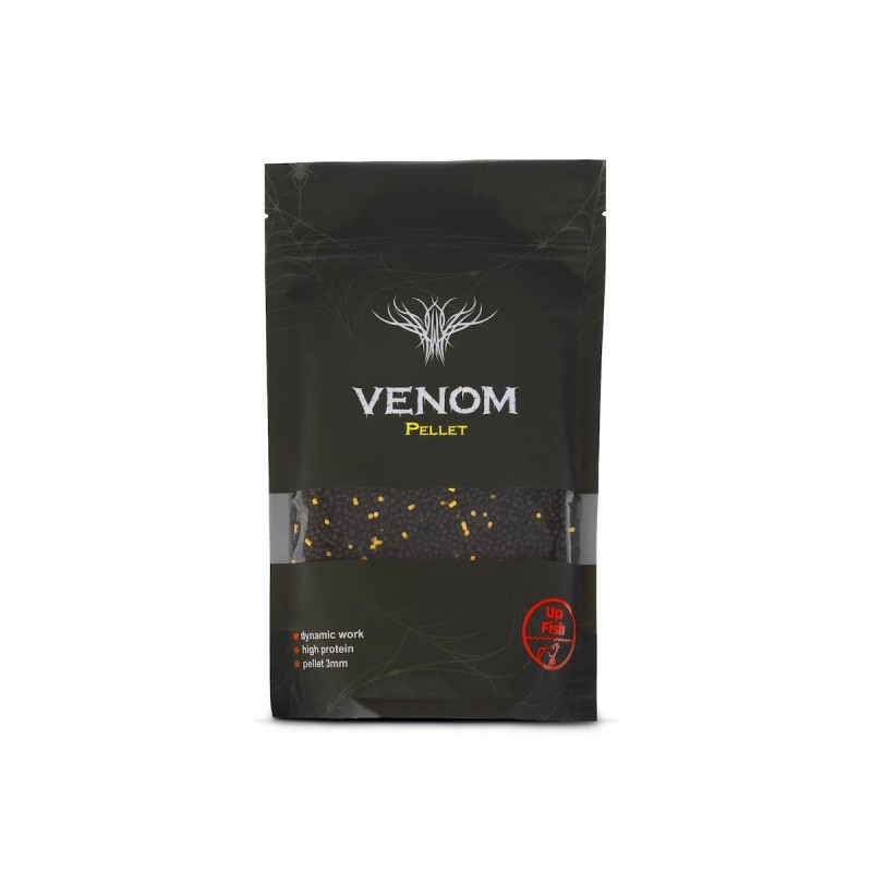 Pellet Up Fish 3mm - Venom - mocna, selektywna propozycja dla wędkarzy, którzy celują w większe ryby i chcą budować łowisko na wartościowym, białkowym pokarmie. To większa frakcja pelletu, która naturalnie ogranicza drobnicę i pozwala skupić się na karpiach oraz większych osobnikach żerujących pewnie i zdecydowanie. Venom to pellet o bardzo wysokiej zawartości białka – ponad 45%, dzięki czemu stanowi tłuste, rybne pożywienie, które długo utrzymuje ryby w polu nęcenia. Intensywna, naturalna woń rybna sprawia, że pellet świetnie pracuje na łowiskach wymagających mocniejszego bodźca pokarmowego. To kolejna odsłona legendarnej linii Venom, nawiązująca również do charakterystycznych barw waftersów z tej serii. W ciemnym, niemal czarnym pellecie znajdują się żółte drobinki, które dodają mieszance atrakcyjności wizualnej i tworzą bardzo naturalny efekt w wodzie. Pellet Venom 3mm latem doskonale sprawdza się samodzielnie, bez dodatku zanęt – jako czysta, treściwa baza pod method feeder. Wiosną i jesienią można go dodatkowo wzbogacić niewielką ilością zanęty, aby przyspieszyć pracę i dopasować mieszankę do chłodniejszej wody.